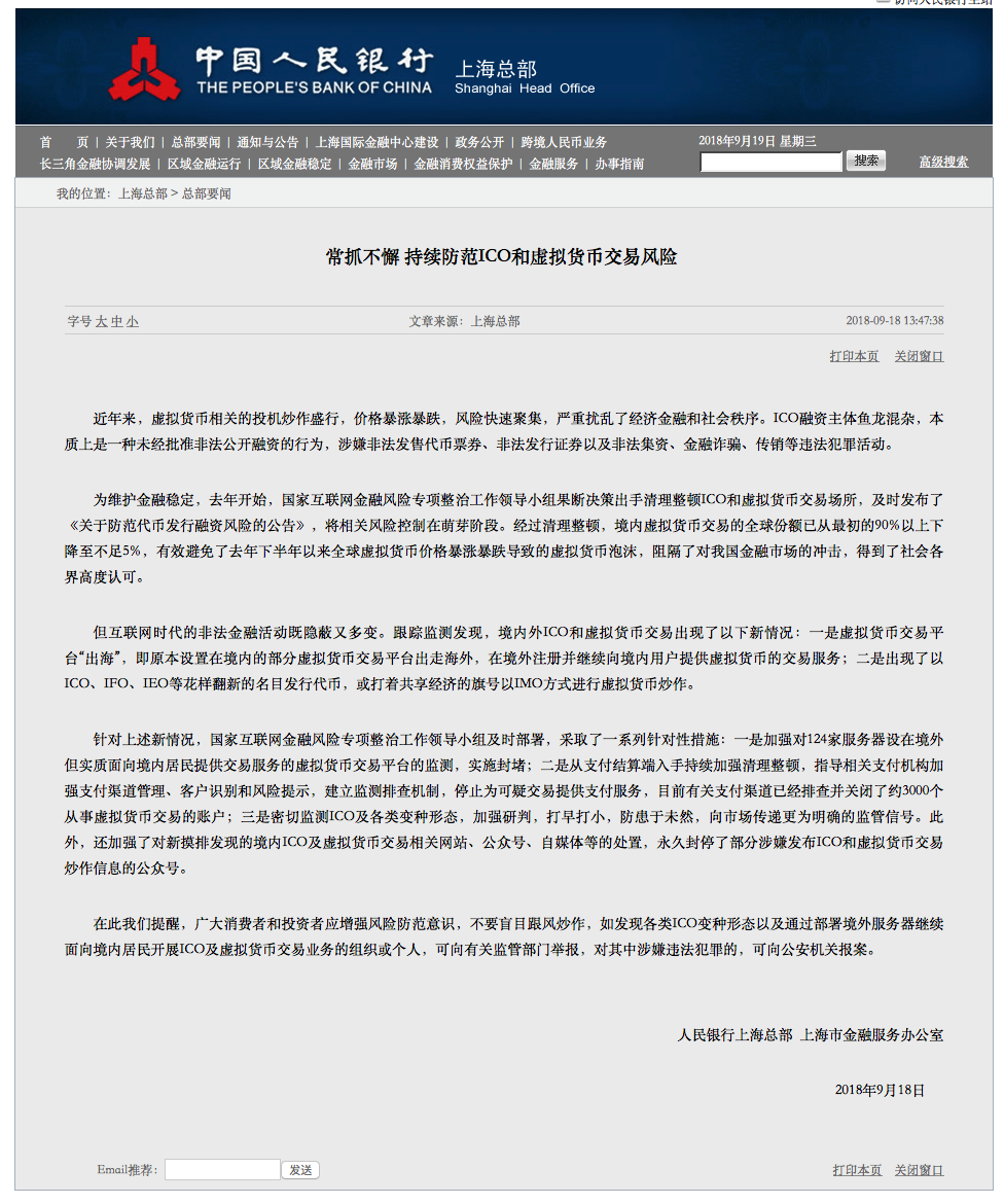 9月18日下午,中国人民银行上海总部和上海市金融服务办公室联合发表题为 《常抓不懈 持续防范1CO和虚拟货币交易风险》的公告。公告指出,“1CO融资主体鱼龙混杂,本质上是一种未经批准非法公开融资的行为,涉嫌非法发售代币票券、非法发行证券以及非法集资、金融诈骗、传销等违法犯罪活动。”