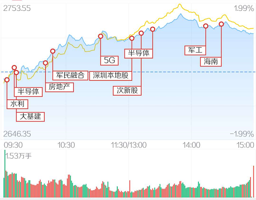 房地产8月份销售数据超出市场预期,广发证券认为,本轮小周期行业竞争格局有所改善,地产集中度提升不可逆转,引发今天房地产板块集体大涨,世荣兆业、招商蛇口、新城控股、万科A、格力地产、沙河股份、保利地产、金地地产等个股全线大涨,这是今天大盘走强最得力的板块,近期我们一直在提示关注这个板块,道理很简单,大盘想企稳,最终是要靠银行和地产,只是短期没有消息刺激,今天正好借机反弹,但不建议大家追涨。阿里巴巴宣布成立平头哥半导体公司,明年4月发布第一款