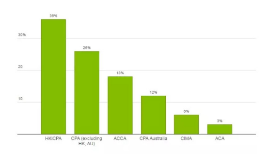 从图中可以看出,香港会计师公会执业证书HKICPA是最常见的资格认证,占36%。香港的会计师对本土认证的认同高于其他区域的同行,大多数都会选择香港会计师公会执业证书,由于只有获得香港会计师公会的认证,审计师才能在客户的审计报告上签字,所以四大会计师事务所也会通过批准进修假期的方式来鼓励员工获得资格证书,银行和金融业雇主往往倾向于简历上有此认证的候选人。