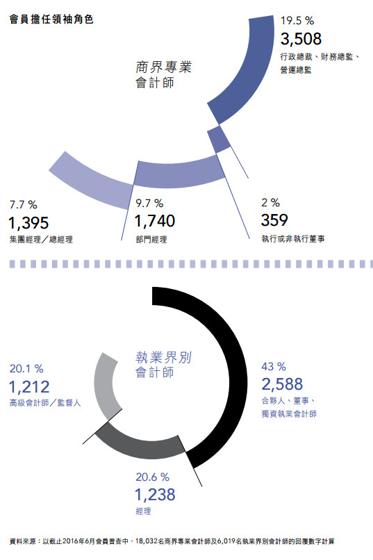 香港会计师公会2016年度报告,截止2016年6月会员调查中,19.5%的商界专业会计师担任行政总裁、财务总监、营运总监,9.7%是部门经理,7.7%是集团经理/总经理,2%是执行/非执行董事;43%的执业会计师是合伙人、董事、独资执业会计师,20.6%是经理,20.1%高级会计师/监督人。