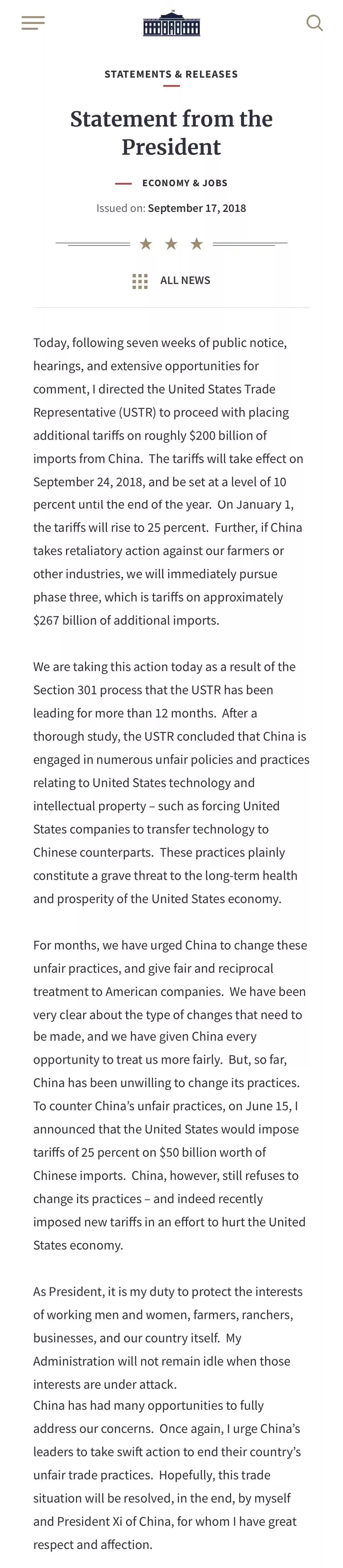 特朗普在上述声明中还指出,如果中国对美国农民或其他行业采取报复行动,将立即实施第三阶段,即对2670亿美元的额外进口征收关税。
