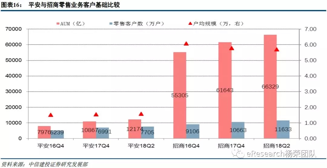 从现状来看,截止2018年6月末,招商银行管理零售客户资产(AUM)6.63万亿,零售基础客户数1.16亿户,而平安银行管理客户资产(AUM)1.22万亿,是招行的18.54%,而客户基础数7705万户,是招商银行的66.24%,这一比例相对而言更接近两家银行零售信贷规模差距。可见,平安银行目前零售转型仍处在增加零售客户基础上,AUM仍然偏低。从户均管理资产规模来看,平安银行只有1.58万元,而招行为5.70万元,差距明显。