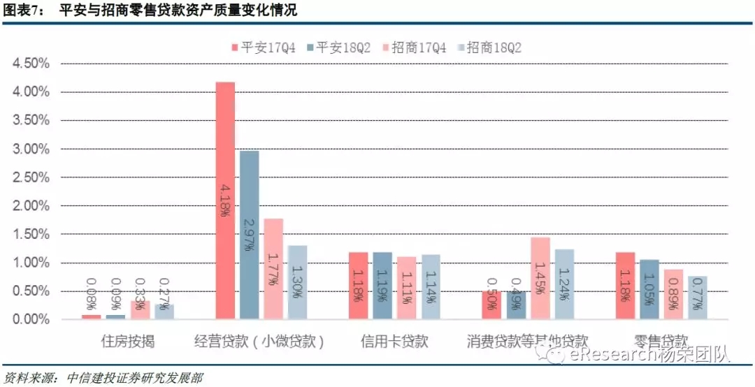 从变化来看,对平安银行而言,2018年6月末,占比较高的消费类贷款不良率较年初下降了1个BP,同时经营性贷款较年初也大幅下降1.21个百分点。但占比最高的信用卡贷款,以及按揭贷款,不良率均较年初上升了1个BP。对招商银行而言,不良率上升的只有信用卡贷款,住房按揭、小微贷款以及消费贷款不良率均较年初有比较大幅度的下降。