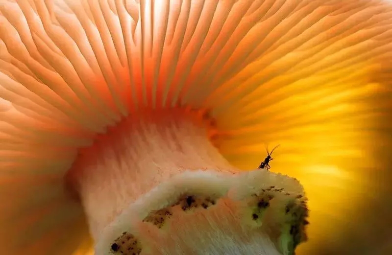 少有人发现,一颗蘑菇的背面着优美的纹理,但是这一切却被一个小小的昆虫珍藏