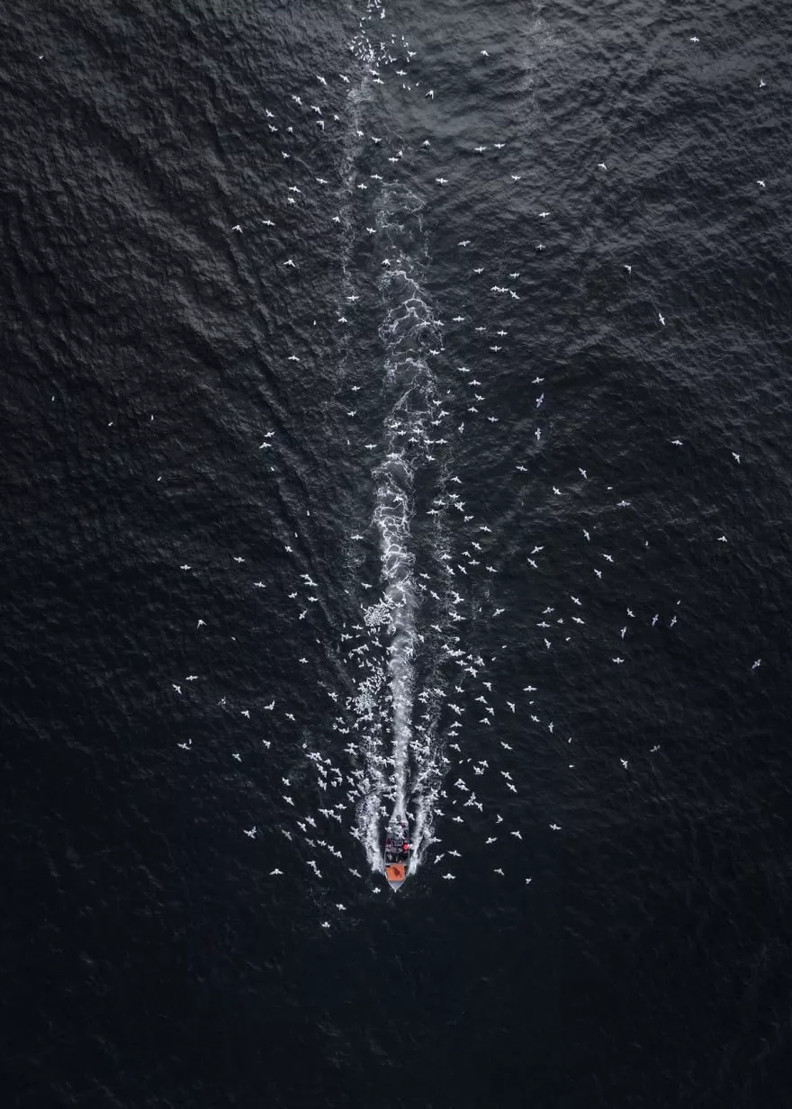 清晨的纽芬兰,一个艘渔船引得一群海鸥追随,像在海面展开了洁白的羽翼
