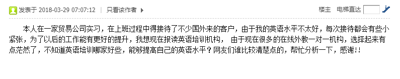 上述是一位网友发出的求助帖,很多时候,我们在走向社会时会发现自己需要储备的东西还有很多,学习就是一项必备技能。但是我们刚迈出学校啊,没有过多的经济基础,不好意思回头找爸爸妈妈拿钱。线下的课太贵,刚实习又没有时间。那么这个时候,网上英语学习的方式无疑是对这个群体的最佳选择了。