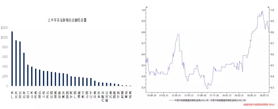 从表内甚至整体信用投放情况来看,现在资本“嫌贫爱富”的情况愈加明显。数据显示,上半年的信用投放大省为东部沿海省份及北京,越偏远的地方信用收缩越严重,扎堆授信现象十分突出。此外,近段时间信用利差被快速拉高,表明现在金融机构的配置风格趋向保守,融资结构也开始向发达地区集中。