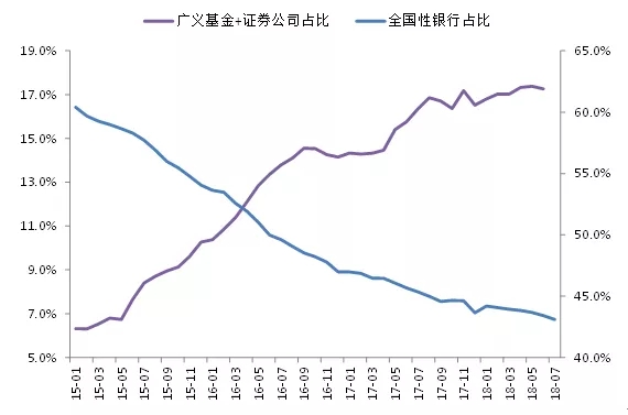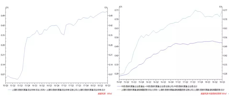 这种情况与常识相悖:金融去杠杆的大环境下,金融机构的资管产品所承担的压力应该是最大的,国有大行的压力应该相对较小,能够购买更多债券。这里出现相反情况的主要原因,可能在于在于这里说的广义基金与之前的广义基金意义不同,这里的广义基金主要指货币基金。