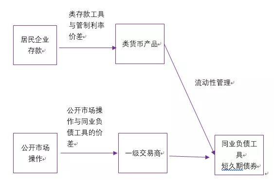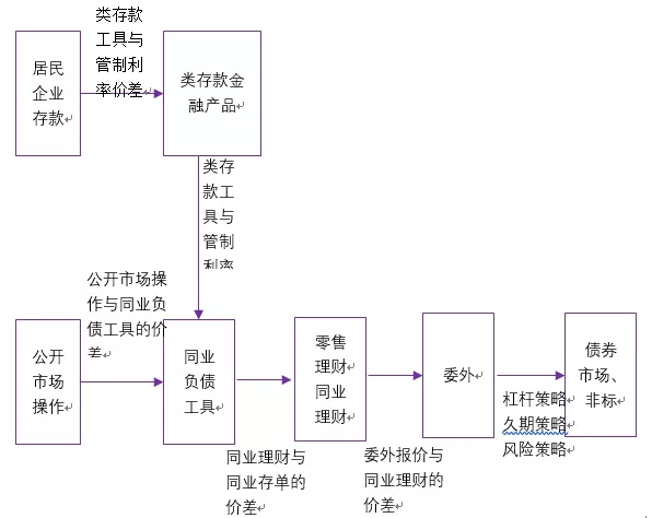 但是银行过多推出类货币产品会产生问题,它会让银行的运作模式发生改变。过去,因为市场利率高于管制利率,居民企业存款会大量向基金类产品和银行理财产品分流,而基金类产品的资金大多被投向银行同业负债工具。所以对于银行而言,分流过程将管制利率提高到了同业负债利率水平,其资金成本被提升。随后,银行同业会将资金投向同业理财以实现套利,最后同业理财会将资金投向机构委外或进行其他投资。这个过程的特点是资金成本逐渐加码。