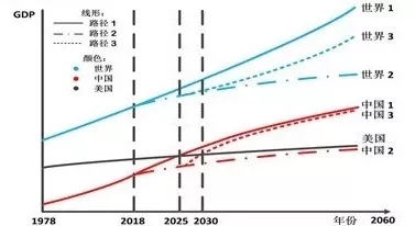 鞠建东教授从中国经济长期增长的角度提出要以发展中国高科技产业为中心,并提出中国经济增长路径的三种情况(如图),路径一为没有中美贸易争端的正常路径,中国GDP将于2025年左右赶上美国,并在2060年达到美国GDP 2.5倍左右。路径二为中美贸易战成功干预中国发展,如图可以看到,中国发展路径显著偏离正常路径。然而,在中国正确应对中美贸易战的情况下,中国经济增长在短期会有相当程度的调整或者下降,但在10年之后经济增长会重新回到“中国道路”的健康发展路径,并在本世纪中叶实现我国的发展目标(路径三)。