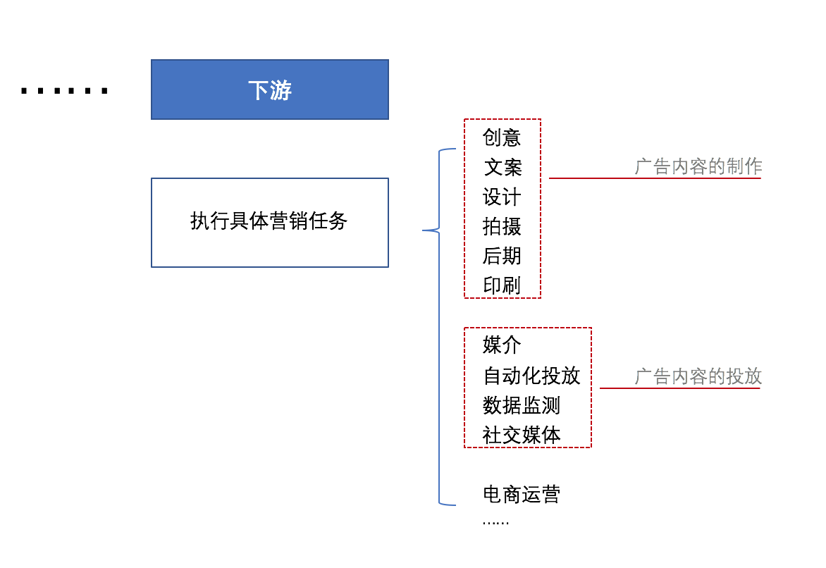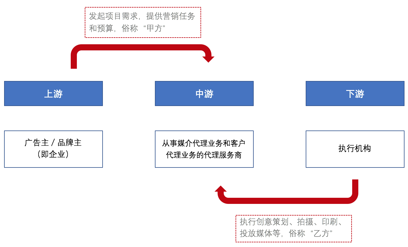 在该视角下,广告营销产业链包括上游:广告主/品牌主(即企业),中游:从事媒介代理业务和客户代理业务的代理服务商,和下游:创意策划、拍摄、印刷、投放媒体等执行机构。