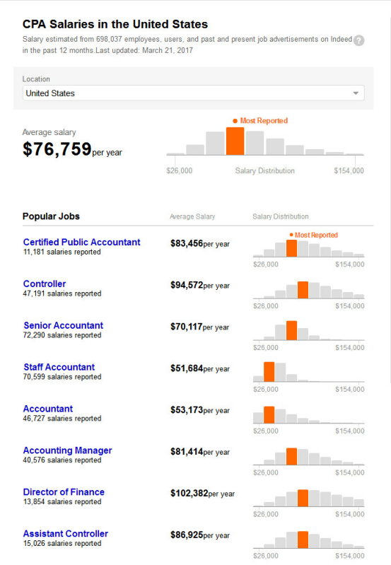 具体到各会计岗位,USCPA持证人的薪酬到底有多高,请看全球最大招聘信息搜索引擎 Indeed 3月21日的最新数据!