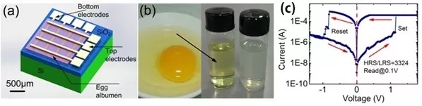 产品利用纯天然鸡蛋白(Egg Albumen)材料和可降解金属研制出生物兼容的可降解非挥发性储存器--忆阻器。该储存器的核心材料是一层30纳米厚的蛋白,上下电极分别由镁和钨薄膜金属构成。改变电极上的电压可以将器件由高阻抗变成低阻抗状态,或反之,达到储存信息的目的。研究表明,此忆阻器可读写数百次,在干燥情况下信息储存三个月而不变。当器件放入水中时,整个器件在3天时间内几乎完全溶解于水,仅留下少许的痕迹。这项研究为未来植入人体的各类电子系统提供了技术基础。