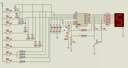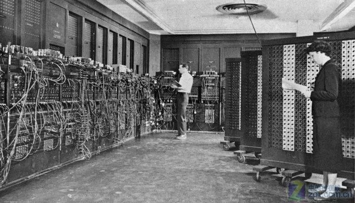 我们来玩个稍微复杂一点的局: 左边有8个输入端,右边有7个输出端,每个输出端对应一个发光管。从左边输入一串信号:00000101,经过中间一堆的电路,使得右边输出另一串信号:1011011。1代表有电压,0代表无电压,有电压就可以点亮对应的发光管,即7个发光管点亮了5个,于是,就得到了一个数字“5”,如上图所示。 终于,我们已经搞定了数字是如何显示的!如果你想进行1+1的加法运算,其电路的复杂程度就已经超过了99%的人的智商了,即便本僧亲自出手,设计电路的运算能力也抵不过一副算盘。 直到有一天,有人用18000只电子管,6000个开关,7000只电阻,10000只电容,50万条线组成了一个超级复杂的电路,诞生了人类第一台计算机,重达30吨,运算能力5000次/秒,还不及现在手持计算器的十分之一。不知道当时的工程师为了安装这堆电路,脑子抽筋了多少回。 接下来的思路就简单了,如何把这30吨东西,集成到指甲那么大的地方上呢?这就是芯片。