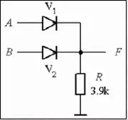 有了二极管,随手搭个电路: 三角形代表二极管,箭头方向表示电流可通过的方向,AB是输入端,F是输出端。如果A不加电压,电流就会顺着A那条线流出,F端就没了电压;如果AB同时加电压,电流就会被堵在二极管的另一头,F端也就有了电压。假设把有电压看作1,没电压看作0,那么只有从AB端同时输入1,F端才会输出1,这就是“与门电路”,同理,把电路改成这样,那么只要AB有一个输入1,F端就会输出1,这叫“或门电路”: 现在有了这些基本的逻辑门电路,离芯片就不远了。你可以设计出一种电路,它的功能是,把一串1和0,变成另一串1和0。 简单举个例子,给第二个和第四个输入端加电压,相当于输出0101,经过特定的电路,输出端可以变成1010,即第一个和第三个输出端有电压。