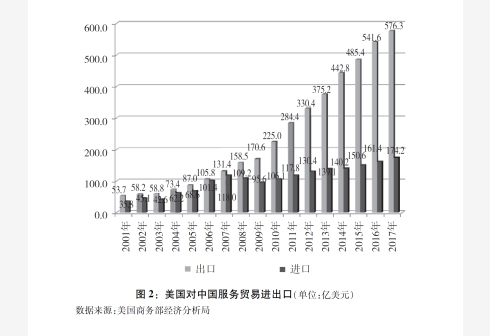 美国是中国服务贸易最大逆差来源地,且逆差快速扩大。据美国方面统计,2007-2017年,美国对华服务出口额由131.4亿美元扩大到576.3亿美元,增长了3.4倍,而同期美国对世界其他国家和地区的服务出口额增长1.8倍,美国对华服务贸易年度顺差扩大30倍至402亿美元。
