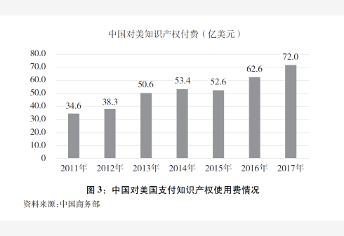 中国对美国支付知识产权使用费持续增加。据中国有关方面统计,美国是中国第一大版权引进来源国,2012-2016年,中国自美国引进版权近2.8万项。中国对美国支付的知识产权使用费从2011年的34.6亿美元增加至2017年的72亿美元,6年时间翻了一番。其中2017年中国对美支付占中国对外支付知识产权使用费总额的四分之一。