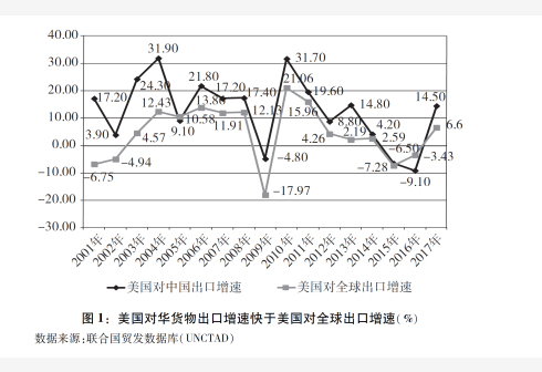 美国对华出口增速明显快于其对全球出口。中国加入世界贸易组织以来,美国对华出口快速增长,中国成为美国重要的出口市场。根据联合国统计,2017年美国对华货物出口1298.9亿美元,较2001年的191.8亿美元增长577%,远远高于同期美国对全球112%的出口增幅①。