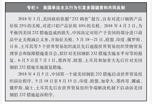对多国产品开展“232调查”。美国政府滥用“国家安全”概念推行贸易保护措施。2017年4月,美国政府依据本国《1962年贸易扩展法》第232条款,以所谓“国家安全”为由对包括中国在内的全球主要经济体的钢铁和铝产品发起“232调查”①,并依据单方面调查结果,于2018年3月宣布对进口钢铁和铝分别加征25%和10%的关税,招致各方普遍反对和报复。2018年4月5日,中国率先将美国钢铝232措施诉诸世界贸易组织。美国宣布自6月1日恢复对欧盟钢铝产品加征关税后,欧盟也予以反击并向世界贸易组织申诉,指责美国的措施违反世界贸易组织规则。欧盟贸易专员马姆斯特罗姆称,美国正在进行“危险游戏”,欧盟如不作回应将等同于接受这些非法关税。截至2018年8月,已有9个世界贸易组织成员向世界贸易组织起诉美国钢铝232措施。2018年7月,美国政府又以所谓“国家安全”为由,对进口汽车及零配件发起新的“232调查”。