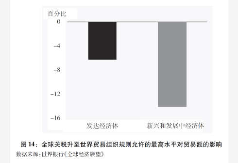 世界银行2018年6月5日发布的《全球经济展望》报告指出,全球关税广泛上升将会给全球贸易带来重大负面影响,至2020年全球贸易额下降可达9%,对新兴市场和发展中经济体的影响尤为明显,特别是那些与美国贸易或金融市场关联度较高的经济体(图14)。世界贸易组织总干事罗伯特·阿泽维多表示,若关税回到关税总协定/世界贸易组织之前的水平,全球经济将立即收缩2.5%,全球贸易量削减60%以上,影响将超过2008年国际金融危机。贸易战对所有人都有害,特别是穷人将损失63%的购买力①。历史教训一再表明,贸易战没有赢家,甚至会给世界和平和发展带来严重影响(专栏8)。