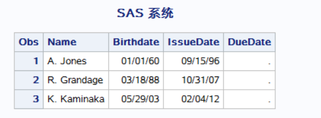 要求:读取原始数据集,四个变量名分别命名为Name、Birthdate、IssueDate、DueDate,打印数据集,要求三个变量Birthdate、IssueDate、DueDate的输出格式为yymmdd.