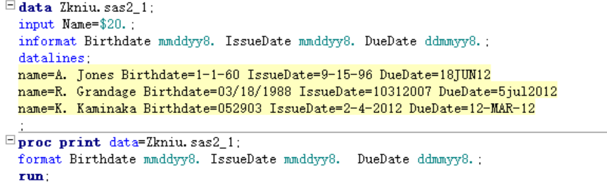 format Birthdate mmddyy8. IssueDate mmddyy8. DueDate ddmmyy8.;