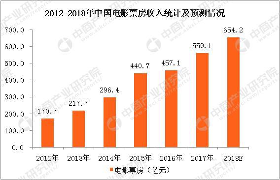 随着中国居民消费水平上升、城市化进程的深入和对文化产品的需求,电影市场还有较大的发展空间。目2017年中国电影市场总票房已达到559亿元,同比增长13.45%。预计到2018年全国电影票房收入将近650亿元。