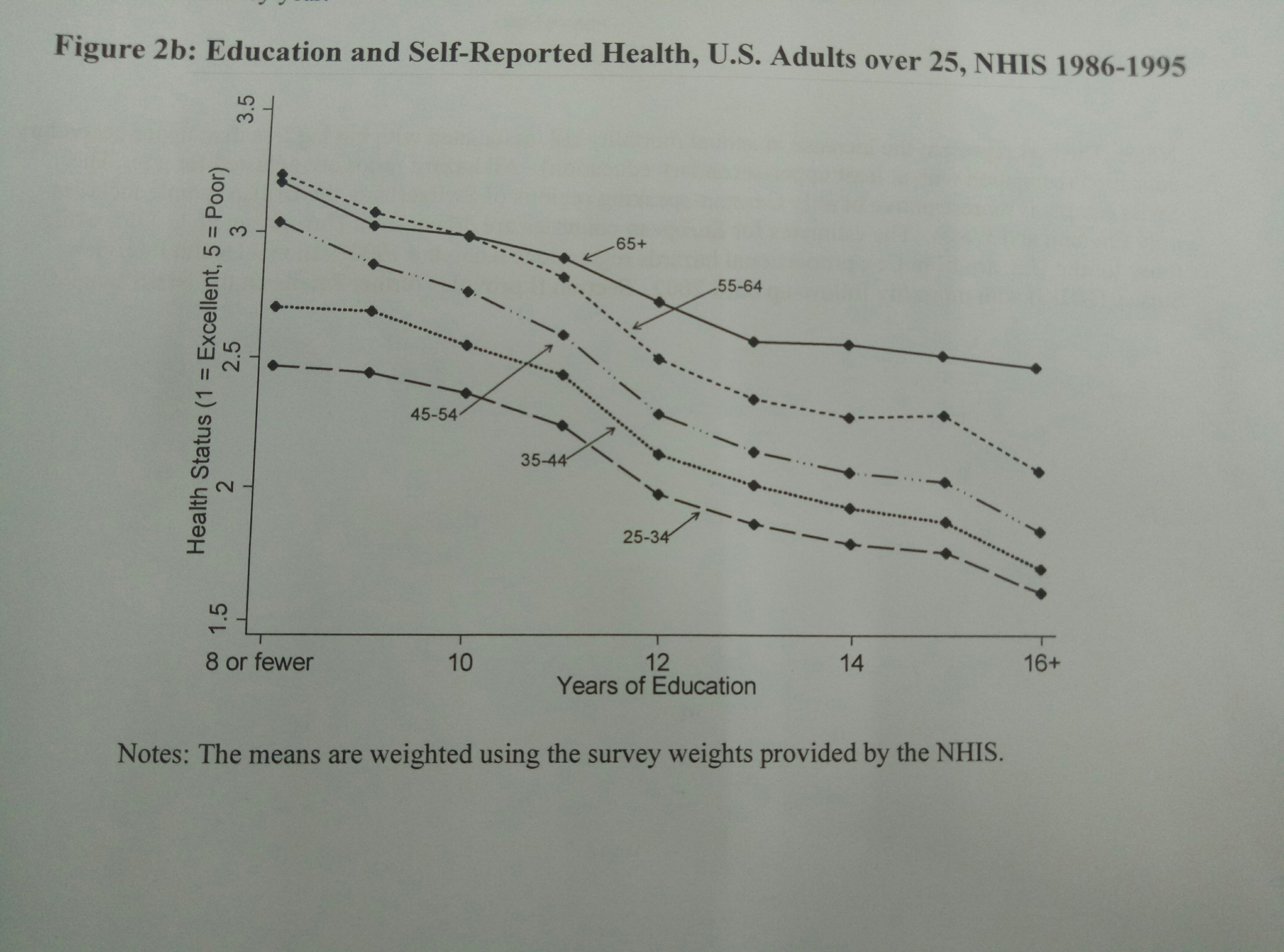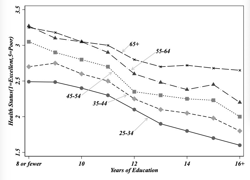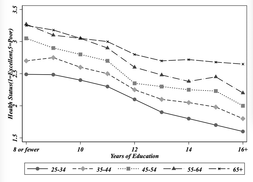 为了在Stata中实现您的需求(即按年龄分组后展示不同教育水平与平均自我评价健康状况的关系),您可以按照以下步骤操作: