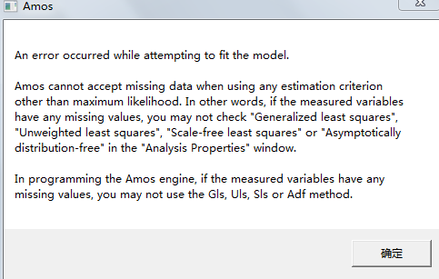 在amos做验证性因子分析时,老是出现这样的报错提示,请问一下是什么原因,该怎么解决?