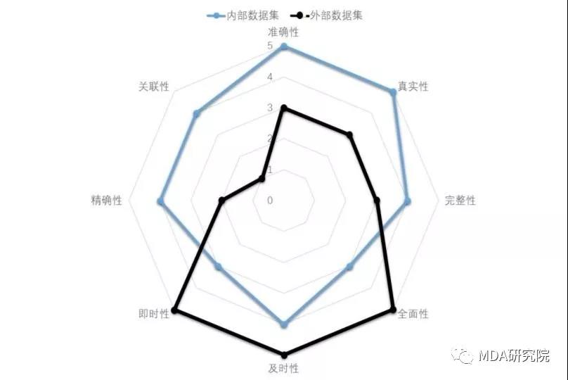 例如常规来讲,内部数据集的准确性、真实性、完整性高,而全面性、及时性、即时性、精确性和关联性方面取决于企业内部对数据的重视程度以及采集数据的技术手段;而外部数据集,如微博数据、互联网媒体数据等,其全面性、及时性和即时性都可以通过技术手段如网络爬虫等得到提高,但在准确性、真实性、精确性上难以保证,也难以控制,而关联性取决于数据采集和挖掘的相关技术。