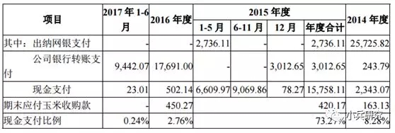 公司通过出纳个人卡和现金支付两种形式进行玉米采购,报告期内(2014年至2017年6月)现金采购占比分别为8.28%、73.27%、2.76%和0.24%,2014年度和2015年度,通过出纳个人卡支付占比分别为90.86%和12.72%。