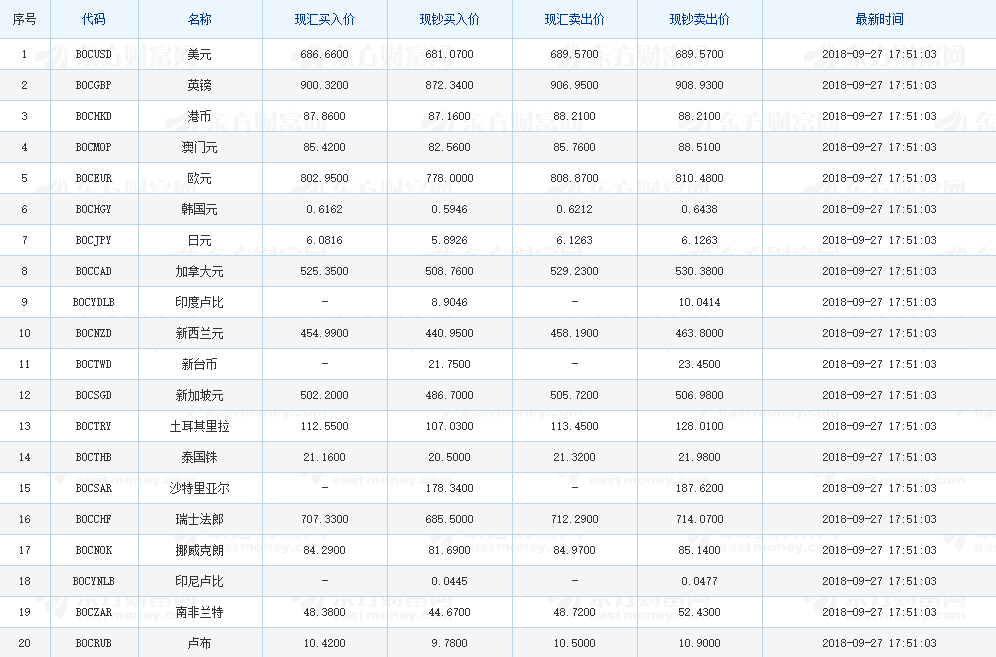 中国银行外汇牌价 2018-09-27(图片来源:东方财富网)