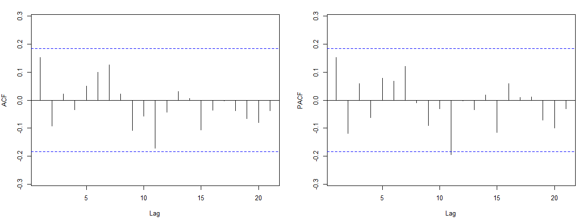糕不停 发表于 2018-11-26 22:20 均不超过虚线,说明这个序列是白噪声,也就是iid,independent and identical,数据之间没有联系,不能用模 ...