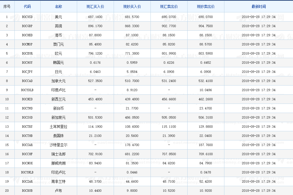 中国银行外汇牌价 2018-09-28(图片来源:东方财富网)