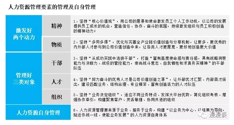 任正非4月20日签发了【2018】028号总裁办电子邮件《华为公司人力资源管理纲要2.0总纲(公开讨论稿)》。这是华为总结三十年来人力资源成功经验基础上,基于当前仍存在的问题,结合行业环境、业务变化及公司战略,制定的指导华为未来人力资源管理发展文件。其中总结、提炼了华为人力资源管理的方法论:激发好“精神”和“物质”两个动力(文化),管理好三类对象“干部、人才、组织”(抓手),构建“以业务为中心、以结果为导向、贴近作战一线、使能业务发展”的人力资源自身体系(目标)。