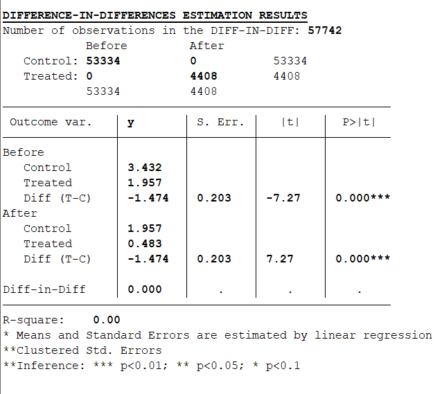 DID模型的结果看不懂,为什么before和after的s.err和t相同啊?有人给解释一下吗?谢谢