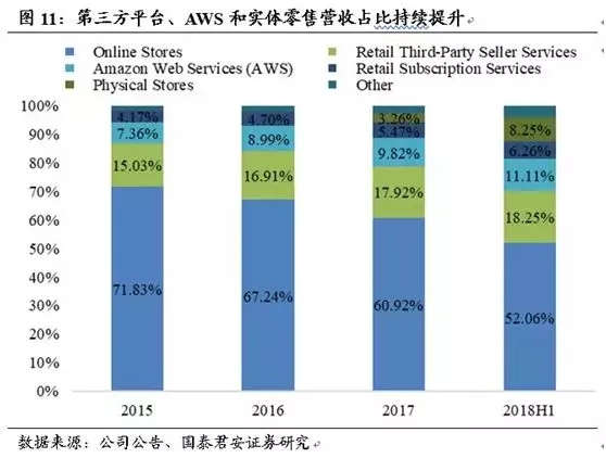 2018第二季度亚马逊在全球公有云市场份额保持在34%,超过排名第2-5名竞争者市场份额之和。AWS用11%的收入贡献了60%的营业利润,帮助亚马逊开启了新的盈利方向,为万亿市值提供了足够的引爆点。