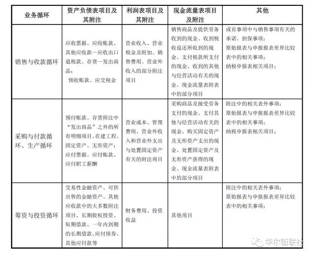 由于分析的侧重点不同,投行人员对业务循环的分类和关注重点与审计师未必相同,但基本要达到一个目的:将关系密切的重要报表项目及附注归入一个业务循环,并从整体上把握其变动规律。例如,“存货”项目往往被归入“采购与付款循环”和“生产循环”,但其中的“发出商品”往往与“销售与收款循环”关联度更高;而“其他应收款”往往被归入“筹资与投资循环”,但其中的“应收出口退税款”往往与出口收入相关度更高,分析时可归入“销售与收款循环”。