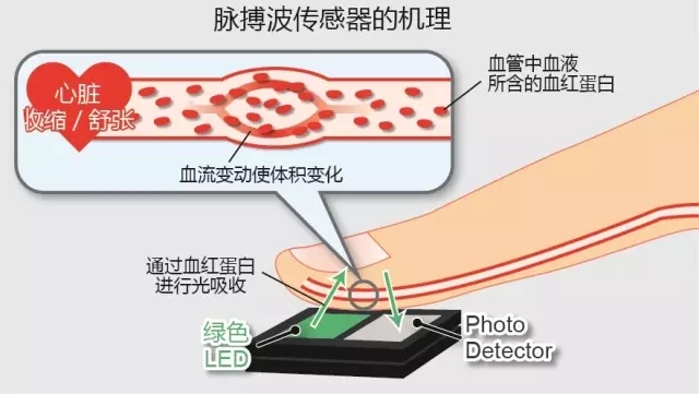 常用的脉搏传感器主要利用特定波长的红外线对血液变化的敏感性原理。由于心脏的周期性跳动,引起被测血管中的血液在流速和容积上的规律性变化,经过信号的降噪和放大处理,计算出当前的心跳次数。