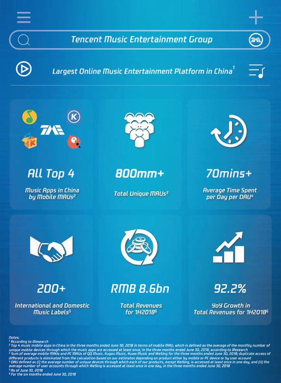 当地时间10月2日,腾讯音乐向美国证券交易委员会(SEC)递交招股说明书,该公司已经实现了规模增长和盈利。招股书披露,腾讯音乐2016年、2017年营收分别达到43.61亿元、109.81亿元,净利润从0.85亿元飙升至13.19亿元。2018年上半年,腾讯音乐的营收达到86.19亿元人民币,同比增长92%。2018年上半年的调整后利润为21.12亿元人民币,同比上升近两倍(189%)。