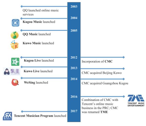 于2016年7月前,腾讯持有中国音乐集团(CMC)约15.8%的股权。于2016年7月,透过一系列交易,腾讯成为CMC的控股股东,持有约61.6%的股权。2016年12月,CMC更名为“腾讯音乐娱乐集团”。招股书披露,自收购CMC以来,腾讯一直是腾讯音乐的控股股东,预计在完成此项发行后,腾讯将继续控制腾讯音乐。