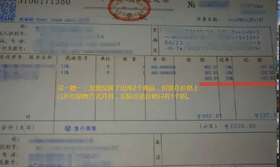 买一赠一开票,因为有实物的出库,发票也需要显示数量,但是赠品并没有实际销售金额,因为是有偿赠送,也不属于视同销售范畴,无需计算缴纳增值税,所以这实质就是对赠送物品进行100%的折扣,我们将赠送商品先输入原价,然后再选中进行100%折扣就行,如图: