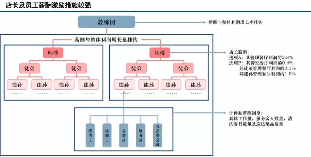 店长的薪酬与其餐厅的盈利能力挂钩,更重要的是,与其徒弟的餐厅挂钩以鼓励他们 培养更多有才能的店长。与该等目标一致,我们店长的薪酬主要包括餐厅某个百分比的利润及基本薪金。