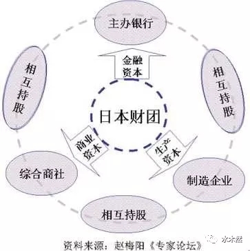 日本财团通常是以横向联合的方式组成,其中由三个核心部分:主办银行,综合商社,大型制造企业。以三井财团为例,樱花银行是其主办银行,三井物产是综合商社,而像索尼、东芝、松下电器、丰田汽车等等制造业,不过是财团推到消费者面前的品牌表演者而已。
