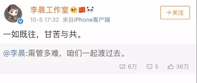 10月5日下午5时许,李晨发微博称:甭管多难,咱们一起渡过去。
