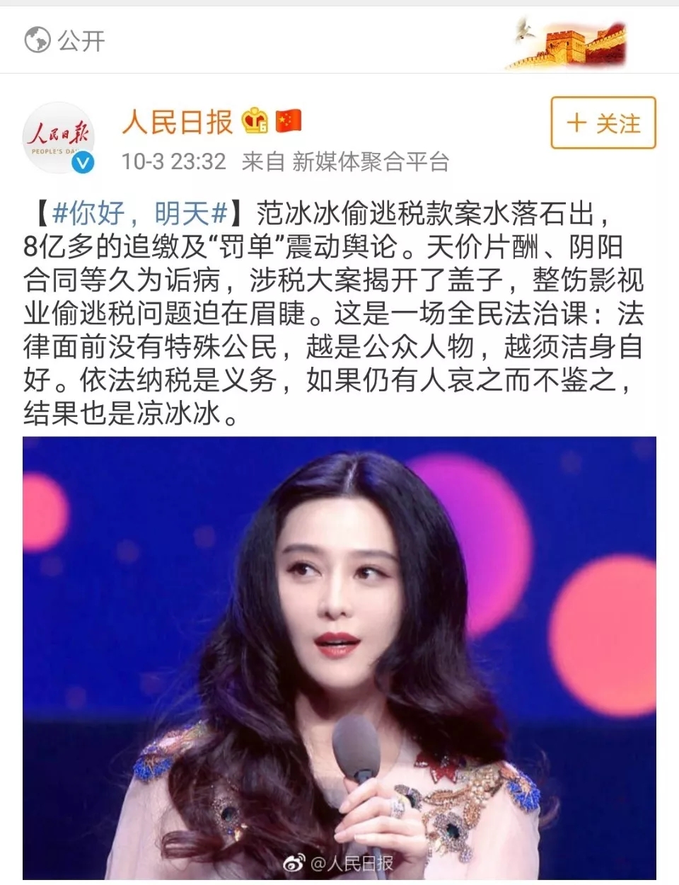 刘。刘告之曰:新作名《朋友圈》,非《手机二》,可无虑。崔信之。后一月见其仍名《手机二》。崔怒斥冯、刘渣滓,并以冰冰之千万契约示众,众惊。永元复示众人“阴阳契”,言优伶可以此逃税,引天下众怒。偷税漏税,百姓所病;而自拟伪契,私饱中囊,尤国法所不容。今有司将有所为,凡此之属,皆心怀惧怖。