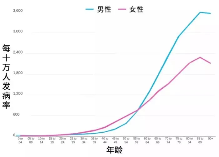▲ 无论男女,当超过55岁后,癌症发病率就呈指数性地上升