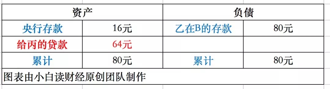 我在4月22日《揭秘:央行是如何印钱的?》一文当中说过:当A银行给客户乙发放贷款后,80元会注入乙在B银行开立的存款账户,即B银行收到了乙80元的存款。和A银行类似,B银行将80元做如下处理:1、提出20%(16元)的存款准备金存入央行准备金账户;2、剩余的64元给客户丙发放贷款。那么银行B的资产负债如下: