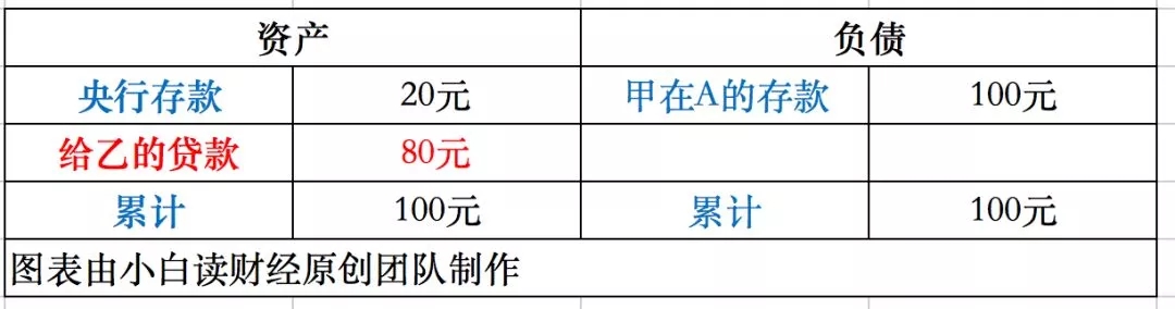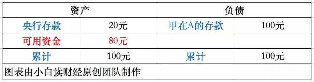 回到上面的例子,甲在银行A存款100元,收到甲的存款后,A将20元存入央行的存款准备金账户,那么银行A的资产与负债情况是这样的:
