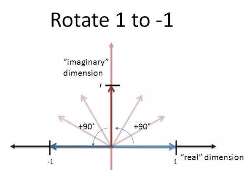 然而如果是...旋转呢!这听起来很疯狂,但是如果我们想像把 x “旋转 90 度”,乘以两次 x 的话,即为旋转 180 度,1 就会变成 -1。